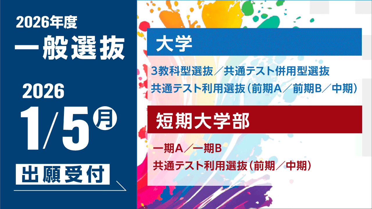 1月5日~出願受付中! 一般選抜【大学】3教科型選抜/共通テスト併用型選抜/共通テスト利用(前期A/前期B/中期)【短大】一期A/一期B/共通テスト利用選抜(前期/中期)