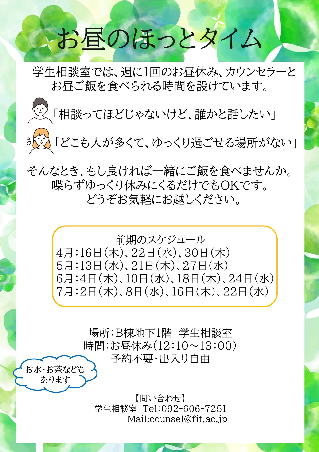 学生相談室では、ランチを取りながら、大学生活の情報交換をしたり、好きなことの話をしたり、話したくない人は静かに過ごしても大丈夫、というゆるやかなランチ交流会を週1回実施します。