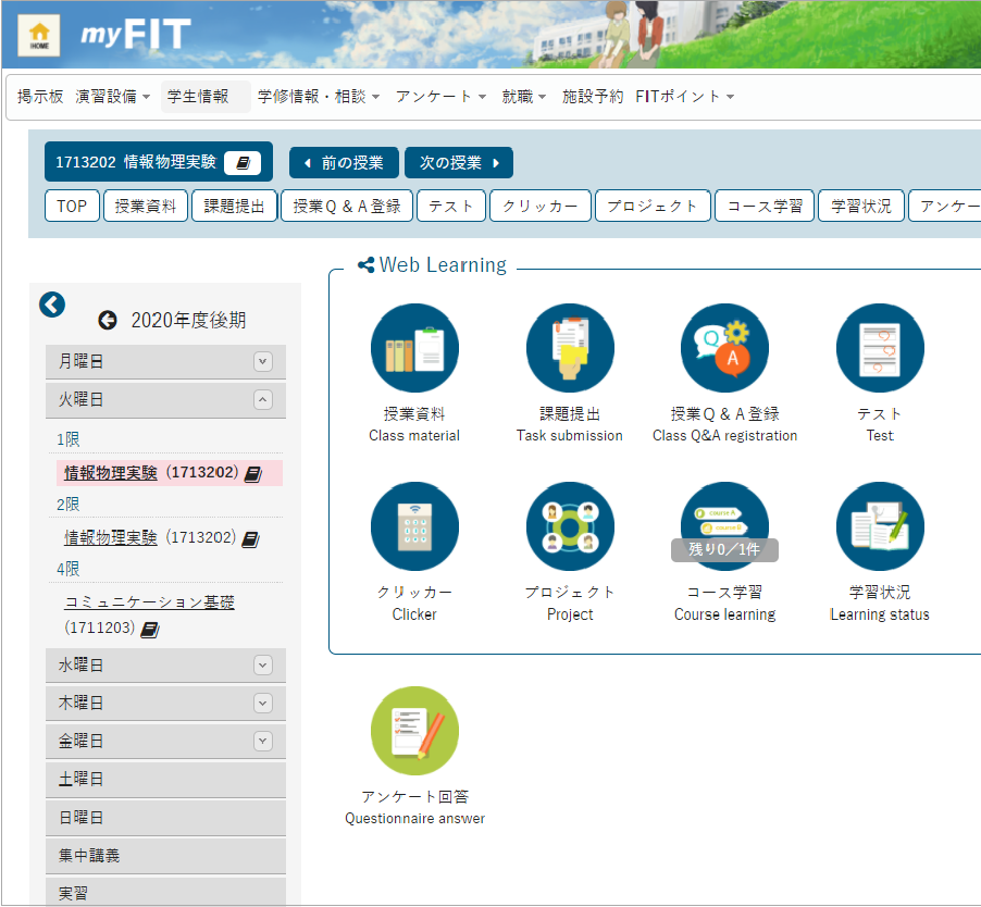 授業資料の配布や講義動画の公開、課題の提出などはmyFITを通して行われます。また、授業や課題について質問があればmyFIT内のQ&Aから担当の先生に尋ねることができます。テスト機能を使って試験が行われる科目もあります。
