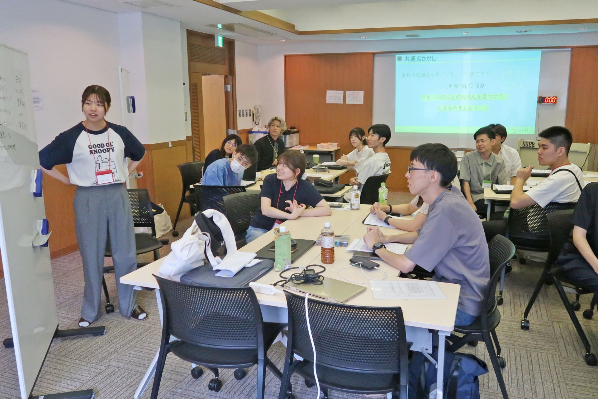 プログラムは4つのワークショップで構成し、初日のワークショップ①では、共通点探しやゲームを通じて参加者同士の距離を縮める交流活動を実施。続くワークショップ②では、各自が準備したプレゼン資料をもとにグループ内で発表を行い、発信力の向上を図りました。テーマは自由設定または指定テーマから選択され、個性豊かな内容が展開されました。