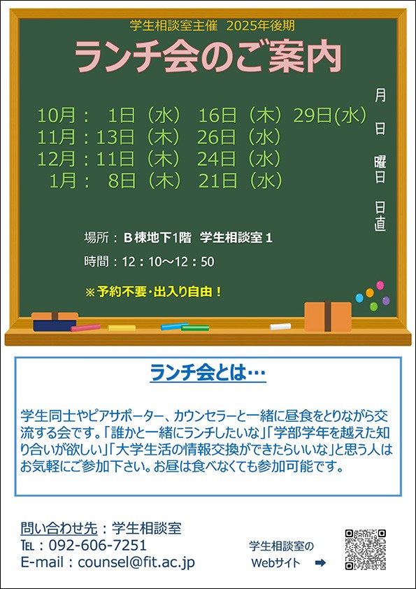 新着情報[学生相談室]ランチ会のお知らせ(本学学生対象) トピックス 2025.09.30 ランチ会のお知らせ 学生相談室では、お昼ご飯を食べながら、学生同士やピアサポーター、カウンセラーと交流するランチ会を実施します。 月 日 10月1日(水)16日(木)29日(水) 11月13日(木)26日(水) 12月11日(木)24日(水) 1月8日(木)21日(水) 時 間 12:10~12:50(出入り自由) 場 所 B棟地下1階 学生相談室1 持ち物 昼食 ※昼食は食べなくても参加可能です。 お問い合わせ 福岡工業大学 学生相談室(B棟地下1階) TEL:092-606-7251 E-mail:counsel@fit.ac.jp Tweet 一覧に戻る TOP 新着情報 トピックス [学生相談室]ランチ会のお知らせ(本学学生対象)