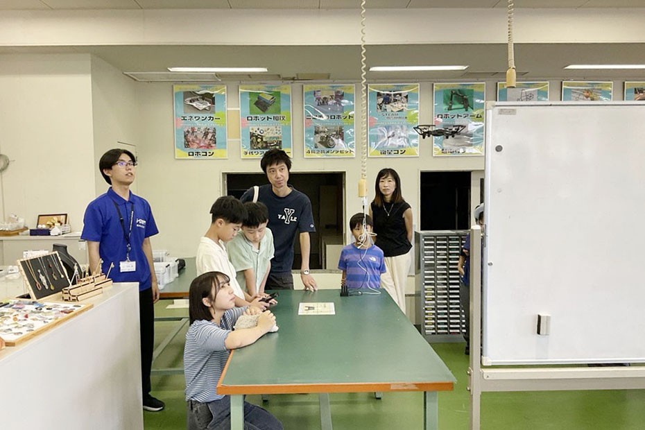 福岡市東区和白地区では、子どもたちが地域の歴史、文化、自然を楽しく学ぶことを目的に、「わじろ地域大学」(コミセンわじろ主催)として4つの地域体験プログラムが開催されています。その1つのプログラムである「第1回ロボットを動かそう!」が8月31日(日)に本学モノづくりセンターで行われ、地域の子どもたちやその保護者合わせて30名が参加しました。 参加者は4つのグループに分かれ、①二足歩行ロボット、②エアーホッケーロボット、③三輪ロボット、④ドローン操縦およびアームロボットの操作をローテーションで体験しました。操作に苦戦しながらも、うまく動かせたときは講師の学生から大きな拍手と声援が送られ、会場は笑顔と歓声に包まれました。