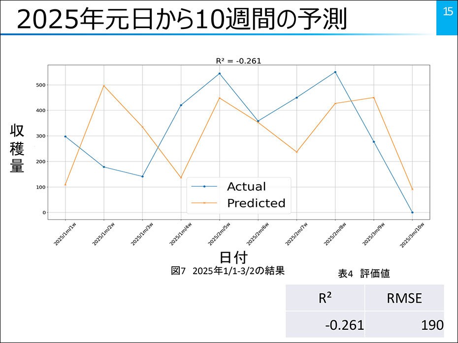 今回の報告では、まず気温や日照などの気象データのみを使った予測モデルを作成し、実際の収穫量との比較を行いました。この結果は、今後導入予定の映像データを活用した予測手法と比較するための基礎データ(Before)として活用されます。
