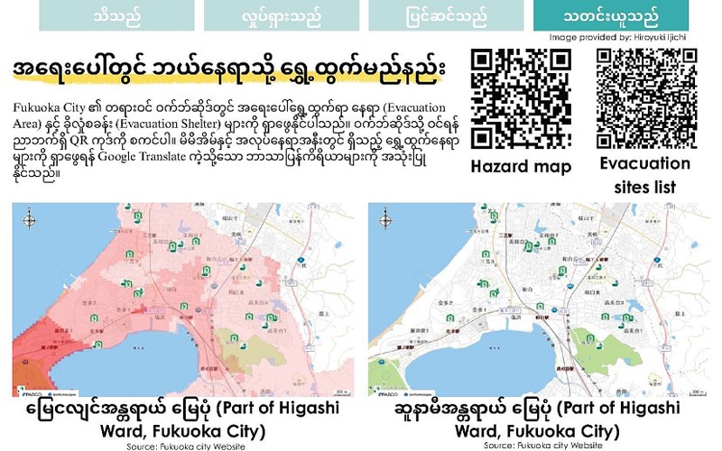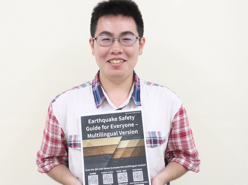 安全ガイドは、福工大で防災サークルの代表を務める社会環境学科4年の川岡大起さんが企画制作しました。防災に興味を持ち、大学1年次に自ら防災サークルを立ち上げて、防災士資格も取得した川岡さん。SNSでコンタクトを取ったり、家族の知り合いに頼んだりして実際に会った外国人に韓国語やミャンマー語のガイドを添削してもらい、自然な表現になるように工夫しました。多くの外国人が暮らす福岡市で、災害時により大切になる共生の意識を広めたい。そう考えてガイドを作りました。