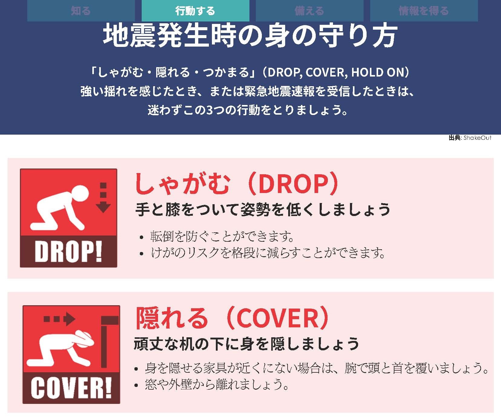 「Earthquake Safety Guide」では、日本がプレート(岩盤)の交差地点に位置していることなど、地震リスクが高い立地状況にあることから始まり、福岡の地下に位置する警固断層帯についても解説しています。また、「津波」や「液状化現象」など、日本人なら耳にすることが多いですが、外国人にはなじみの薄い地震に関する事柄についても丁寧に説明しています。この上で、地震発生時の身の守り方(しゃがむ、隠れる、つかまる)や、家具の転倒防止対策についてのほか、実際に地震の発生時に取るべき行動(避難場所の確認や連絡方法、持ち出し品など)について解説し、外国人に地震を意識する機会を持ってもらうことを目指しています。