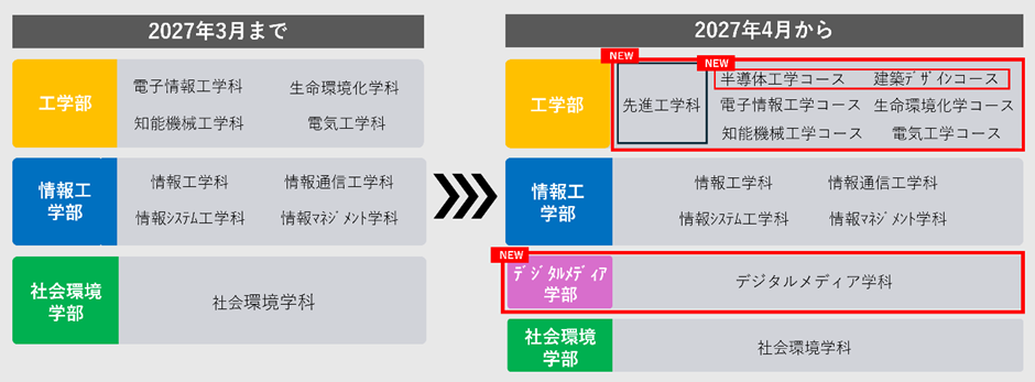 新学科では、従来の4つの学問分野(電子情報工学、生命環境化学、知能機械工学、電気工学)に加え、地域ニーズの高い「半導体工学」と「建築デザイン」を新設し、計6コースを設置する予定です。