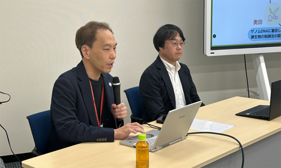 本学の研究支援制度に採択された教員による成果報告からスタートした第1部では、生命科学、教育支援システム、材料化学といった多様な分野から研究テーマが発表されました。最新のゲノム情報解析を活用した生命動態研究や、学生の学びを深めるICT教育システムの実践報告、ナノテクノロジーによる新素材創成および国際的な学術誌への論文掲載などを報告し、本学の幅広い分野の研究成果について学内外に発信されました。対面とオンラインを併用し合計79名が参加し、今後の産学連携の強化や分野横断型研究の推進による革新的なアプローチに期待が高まる時間となりました。