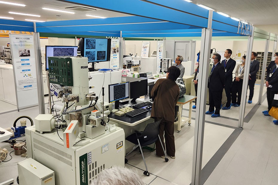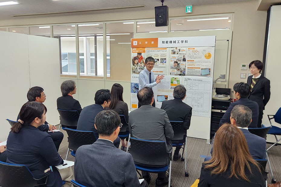 会場移動後には全9学科のブースに分かれ、教員が各学科の研究やトピックスを説明するポスターセッションも実施し、ご参加いただいた企業の皆様に本学の教育・研究活動をより深く理解していただきました。さらに、図書館、モノづくりセンター、総合研究機構を見学していただき、本学が進めている全学的な教育・研究環境の機能向上・充実化についても紹介しました。