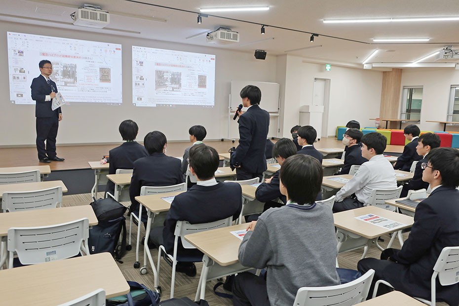 加藤教授は、かつて福岡工業大学に勤務され、2017年度から2023年度まではi-STEAMのTechnologyの分野を担当されていました。法政大学と福岡工業大学は2024年3月に学術連携協定を締結しており、加藤教授は両大学が共同実施するグローバルPBLなどで、現在も福岡工業大学と連携されております。それらのご縁もあり今回、附属城東高校にお越しくださいました。講演では、ご自身の研究紹介をはじめ、大学の講義内容を例に高校で学ぶ数学・物理・英語などの重要性、グローバルPBLおよび両大学のグローバル化への取り組み、福岡工業大学の優れた教育環境が特に工業科出身の学生を大きく伸ばすこと、そして最近注目されている技術など、多岐にわたるお話をいただきました。約1時間の講演後には高校生から多数の質問が寄せられ、活発な質疑応答が約30分にわたり行われました。