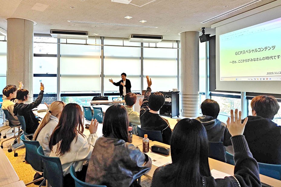 2025年11月22日(土)、グローバルな環境でのキャリア形成を目指すGlobal Challenge Program (GCP)では、GCPで学ぶ22名の学生(1年生~4年生)と国際連携室の職員4名の総勢26名が出席し、内海良介氏(人材系IT企業/企画推進担当)による社会人プロフェッショナル講話を開催しました。