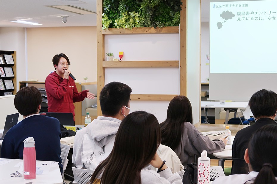 今回は「企業が求める人材と大学の学び」をテーマに、卒業生で株式会社サン電工社の道下友花氏より「企業はなぜ面接をするのか」「面接で何を見ているのか」について講演いただきました。道下氏は、就職活動において面接は試験ではなく企業と学生の相互理解の場であり、完璧な答えより自分らしさを伝えることが重要と強調しました。また、評価ポイントは、質問を理解し整理して答える力、自己PRと志望動機の一貫性、協調性や価値観であることや、採用される人は企業理念を理解し、強みを具体的なエピソードで語れることが特徴で、主体性や失敗から学ぶ力も重視されることなど、具体的なアドバイスが伝えられました。
