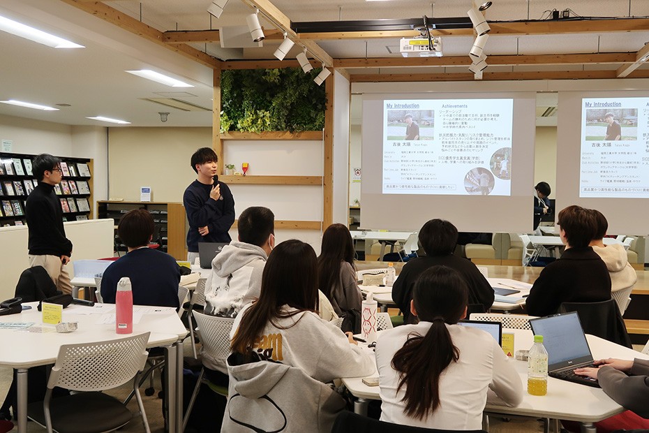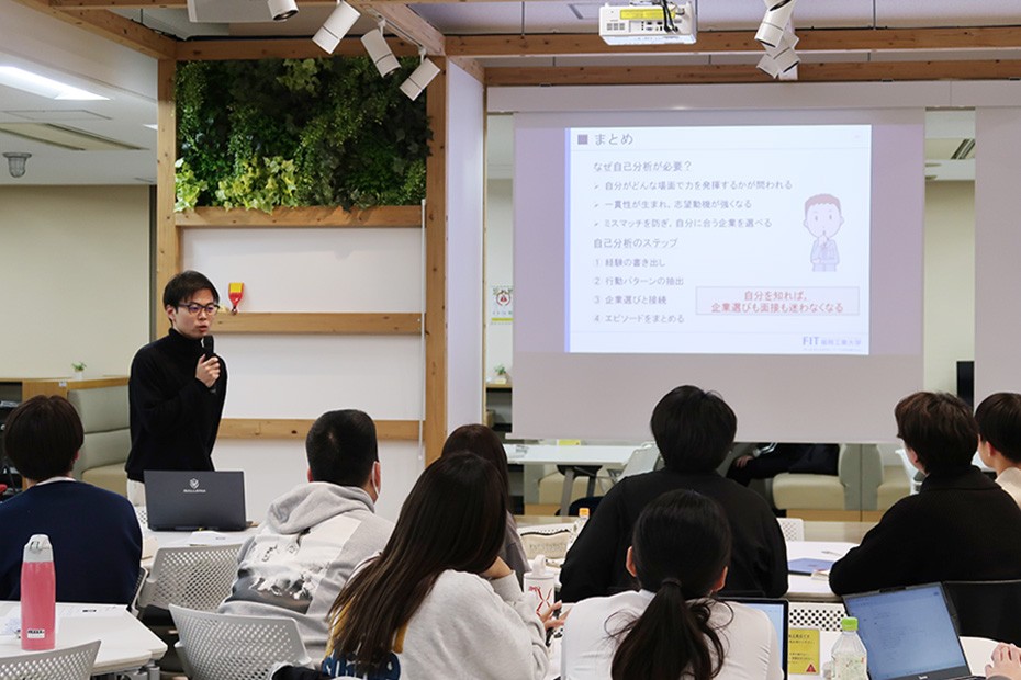 続いて、内定を得た修士2年生2名が就職活動のロードマップを紹介し、自己分析の重要性を説明しました。自己分析は力を発揮できる場面を把握し、志望動機の一貫性を高め、企業選びや面接で迷わなくなるために必要であること、エピソードは「結論→理由→具体例→今後」の流れで整理し、数字を入れると説得力が増すことなどのアドバイスがありました。その後参加者は自己分析シートを使い、学生時代の経験を掘り下げてグループ内で共有しました。