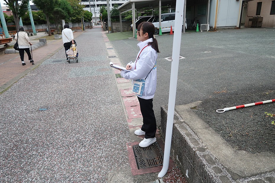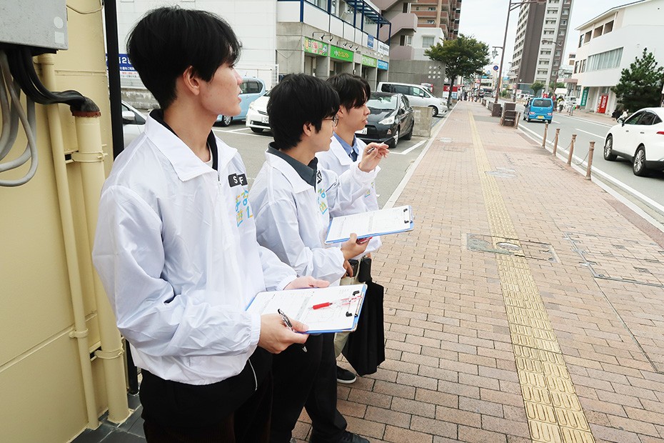 この取り組みの一環として、昨年度に続き、社会環境学部社会環境学科の上杉研究室は、10月22日(水)と25日(土)の2日間、古賀市主催の「ウォーカブル社会実験」における歩行者分布調査に協力しました。調査では、古賀駅西口周辺の複数箇所を車両通行止めにして歩行者天国の状態を再現し、歩行者の通行量や通行方向の変化を確認しました。学生たちは、あらかじめ決められた地点で1時間あたり13~15箇所の調査を実施しました。