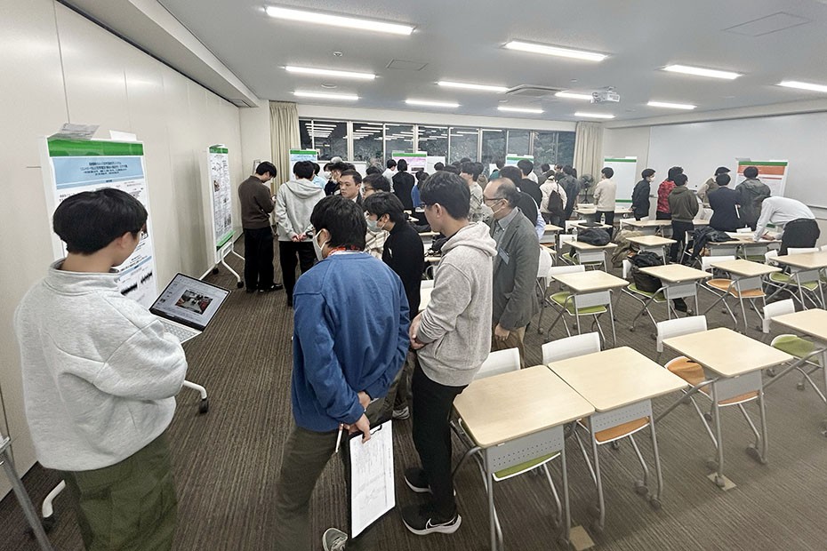 本交流会には、工学部と情報工学部の9つの研究室が参加し、大学院生および学部生が、ポスター発表形式により日頃の研究成果を紹介しました。さらに、教員も交えた活発な議論が行われ、異なる分野の視点を取り入れた質疑応答は、学生にとって新たな気づきや視野の拡大につながる貴重な機会となりました。参加者からは、「ポスター形式は議論が盛り上がり、色んな分野の研究が聞けててよかったです。」、「貴重な機会に参加できてよかったです。」といった感想が寄せられ、学内での研究交流の重要性が改めて認識されました。研究発表後にはFIT BBQにて懇親会が開催され、研究の枠を超えたリラックスした交流の場となるとともに、教職員の投票により優れたポスター発表に最優秀賞、優秀賞、特別賞が授与されました。