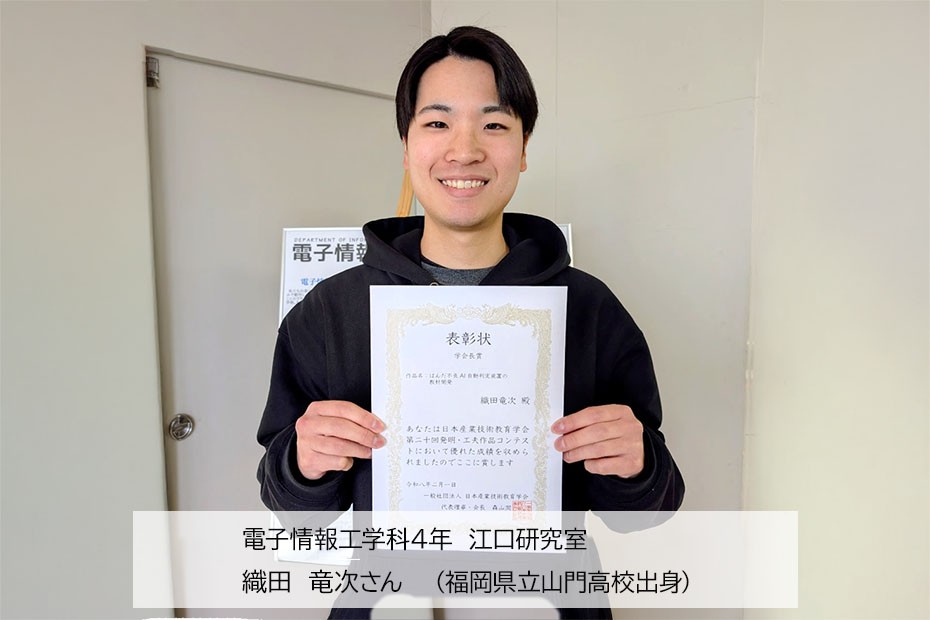 『第20回技術教育創造の世界(大学生版)発明・工夫コンテスト』(主催:一般社団法人 日本産業技術教育学会)において、工学部電子情報工学科4年・江口研究室の学生が、最高の賞となる「学会長賞」を受賞しました。受賞作品は「はんだ不良AI自動判定装置の教材開発」で、電子工作教育とAI画像認識を融合した実践的な教材として高く評価されました。