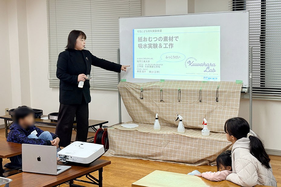 2月7日(土)、粕屋町の原町区公民館にて、本学モノづくりセンターの「理科教材開発プロジェクト」が、こども達を対象に化学に関する実験やモノづくりの体験イベントを実施しました。