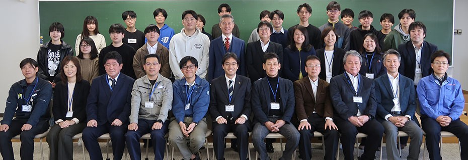 2026年1月14日、古賀市に事業所を置く株式会社ナダヨシ様、株式会社増田桐箱店様、日本食品株式会社様、JR九州エンジニアリング株式会社様、三友ボディー株式会社様、有限会社左衛門様の6社に加えて、古賀市の田辺市長ならびに商工政策課の皆様もお招きし、計14名の皆様に学生の成果報告を聴講いただきました。
