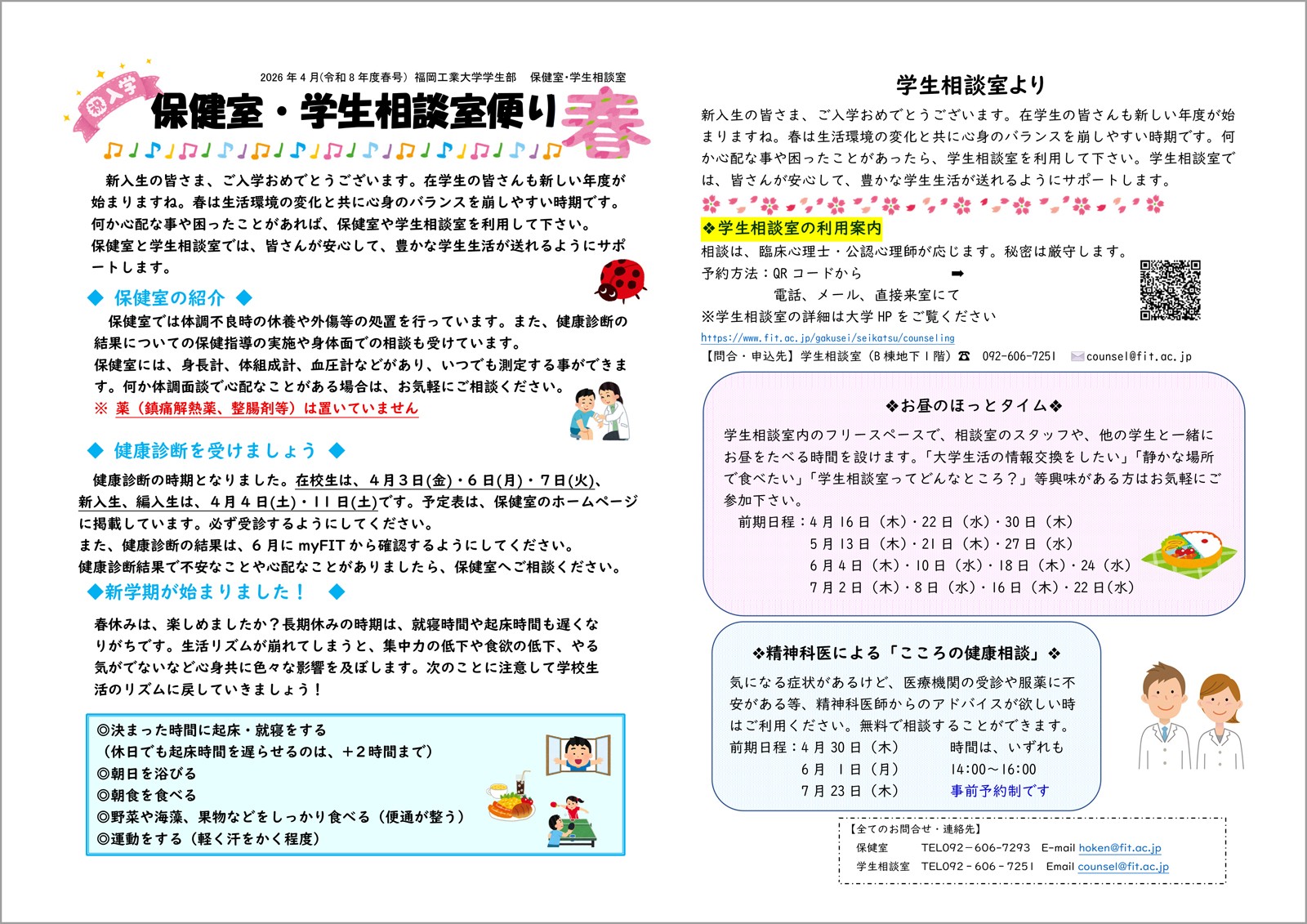 新着情報[保健室・学生相談室]便り春号のお知らせ トピックス 2026.04.01 保健室・学生相談室では、皆さんが健康で楽しい学生生活が過ごせるように 心と身体の両面からサポートしたいと考えています。 便り秋号(クリックしてPDFをご覧いただけます) お問合せ 福岡工業大学 保健室 TEL:092‐606-7293(受付直通) E-mail:hoken@fit.ac.jp 福岡工業大学 学生相談室 TEL:092‐606-7251(受付直通) E-mail:counsel@fit.ac.jp Tweet 一覧に戻る TOP 新着情報 トピックス [保健室・学生相談室]便り春号のお知らせ