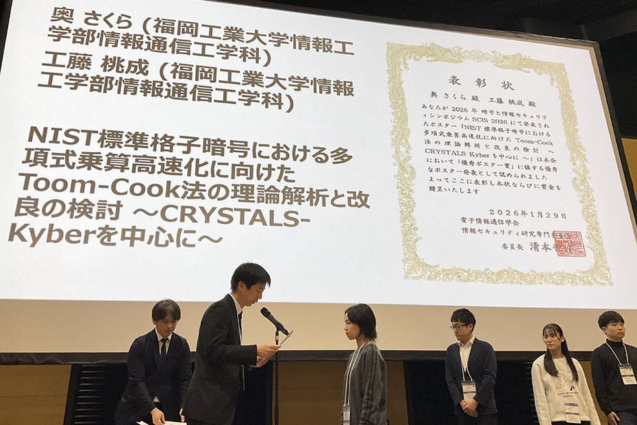 受賞した学生は学部1年次から数学および暗号分野に強い関心を持ち、情報通信工学科工藤研究室で自主的なゼミ活動を継続してきました。学部2年次には、耐量子計算機暗号として国際的に注目される「格子暗号 CRYSTALS-Kyber」の効率化に関する研究に取り組み、Toom–Cook法による多項式乗算アルゴリズムの理論解析を通じて、同暗号において有効なパラメータ領域を精密に評価する成果を挙げました。これらは暗号実装の効率向上に寄与する実用的価値の高い成果です。