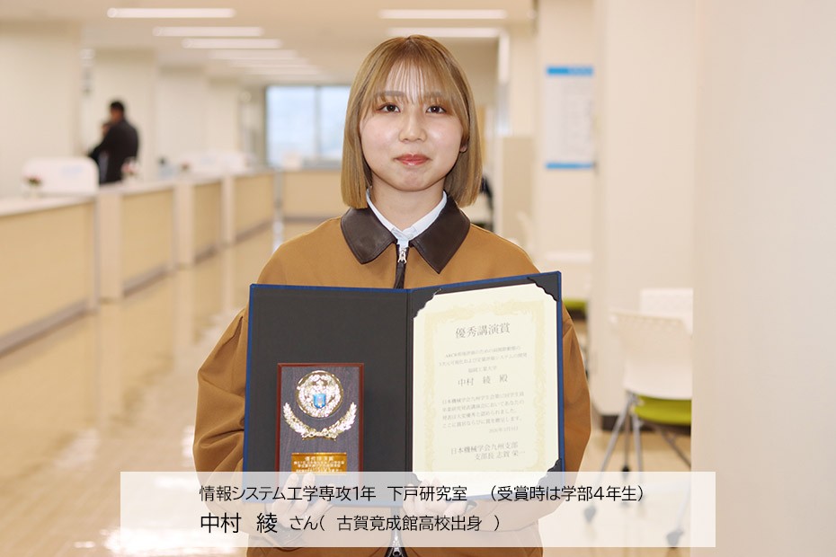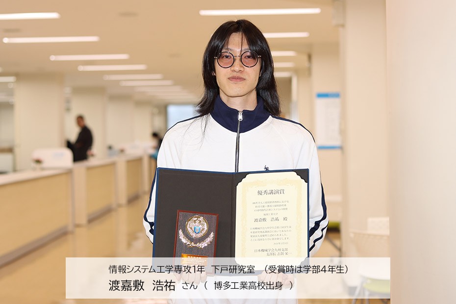 2026年3月9日(月)、長崎大学にて開催された「日本機械学会九州学生会 第57回学生員卒業研究発表講演会」において、情報システム工学専攻1年(受賞時は学部4年生)下戸研究室の学生2名が、それぞれ異なる分野で「優秀講演賞」を同時受賞しました。