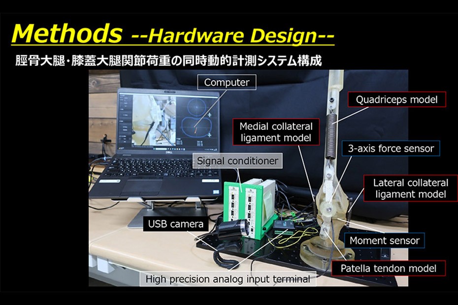 変形性膝関節症に対する全人工膝関節置換術(TKA)は、痛みの軽減や生活の質の向上に大きく貢献してきましたが、術後成績や満足度に課題が残る症例も少なくありません。近年、インプラント設計や術式が成熟する中で、手術中における関節バランスの最適化が、良好な術後成績を左右する重要な要因として注目されています。本研究では、これまで十分に評価されてこなかった膝蓋大腿関節に着目し、脛骨大腿関節と膝蓋大腿関節の荷重を手術中に同時かつ動的に計測できる新たなシステムの開発を目指しました。靭帯・腱を模擬した膝関節モデルを用い、屈曲伸展運動中の荷重変化や関節安定性を多角的に評価することで、本システムの有効性を検証しました。本研究はTKAの術中評価を高度化し、術後の痛み軽減や患者満足度向上に寄与することが期待されます。